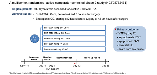 SHR-2004是AG旗舰厅医药自主研发的一种抗FXI的人源化单克隆抗体,通过阻断内源性凝血途径的级联反应过程发挥抗凝作用。SHR-2004-201研究是一项多中心、随机、开放标签、阳性对照的II期临床研究(NCT05752461),旨在评价择期单侧TKA患者单次皮下注射或静脉滴注SHR-2004注射液预防VTE的疗效和安全性。