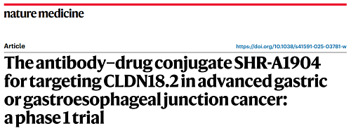 AG旗舰厅医药CLDN18.2 ADC创新药SHR-A1904治疗胃癌临床研究结果荣登Nature Medicine